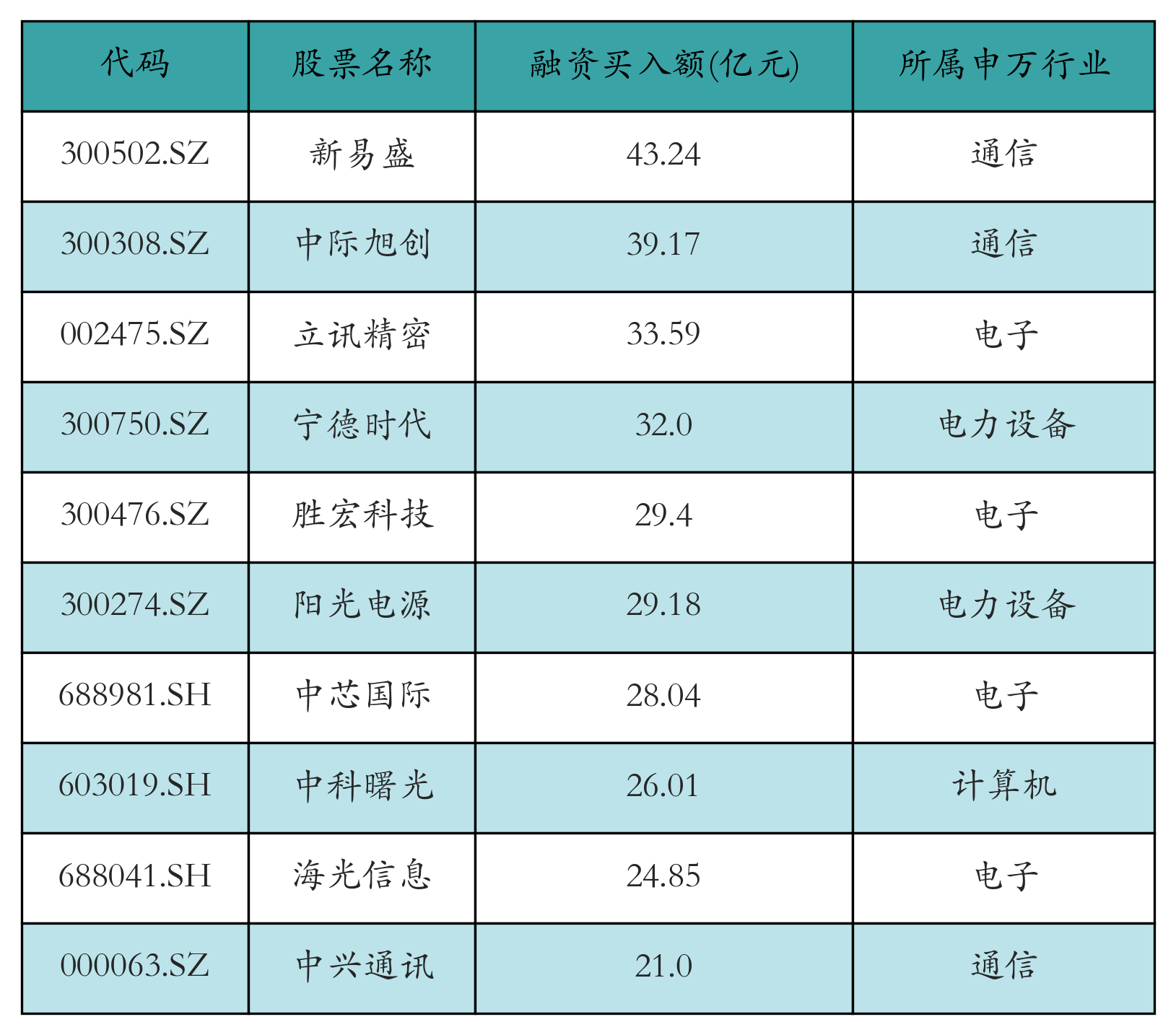 两市共有3444只个股有融资资金买入,其中新易盛、中际旭创、立讯精密排名前三,买入金额分别43.24亿元、39.17亿元、33.59亿元。融资买入额前10个股详情见下表: