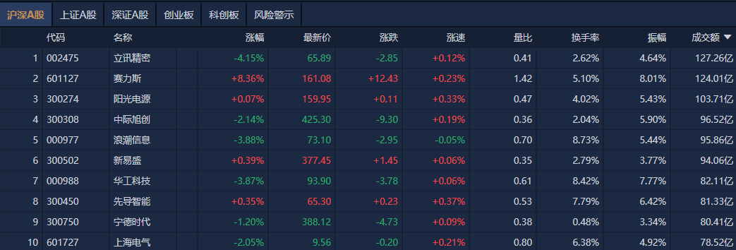 个股方面,立讯精密成交额超127亿元居首,赛力斯、阳光电源、中际旭创成交额靠前。